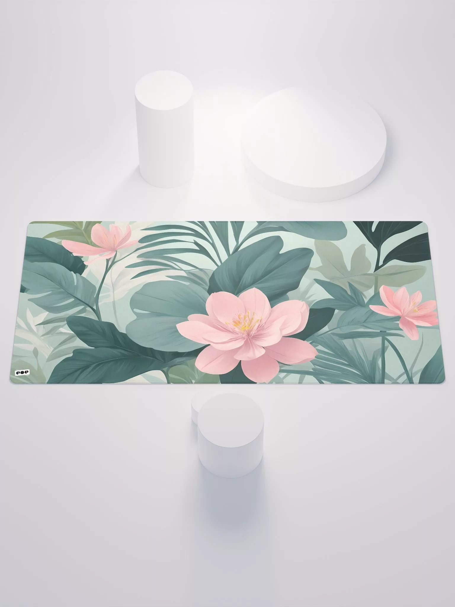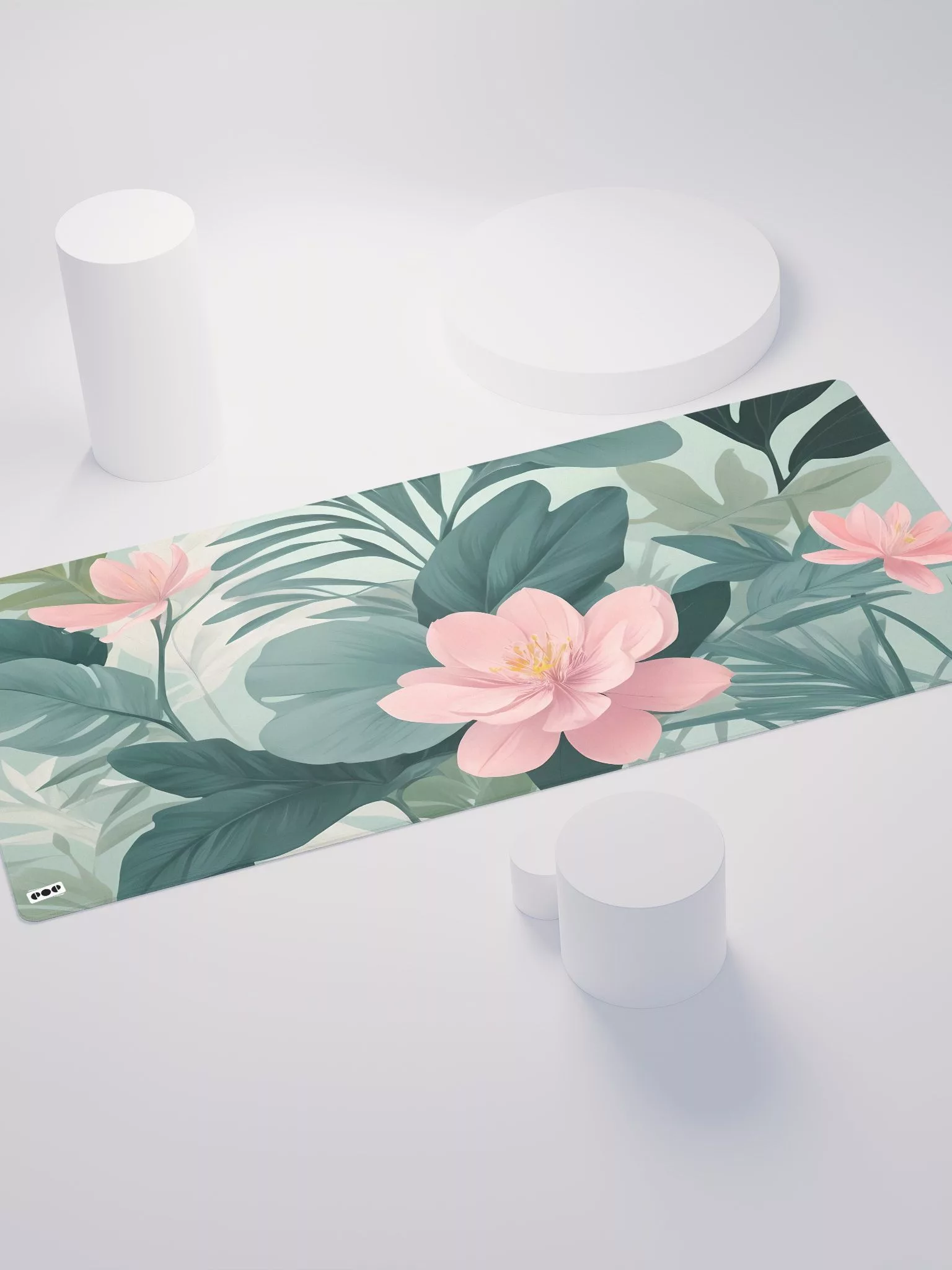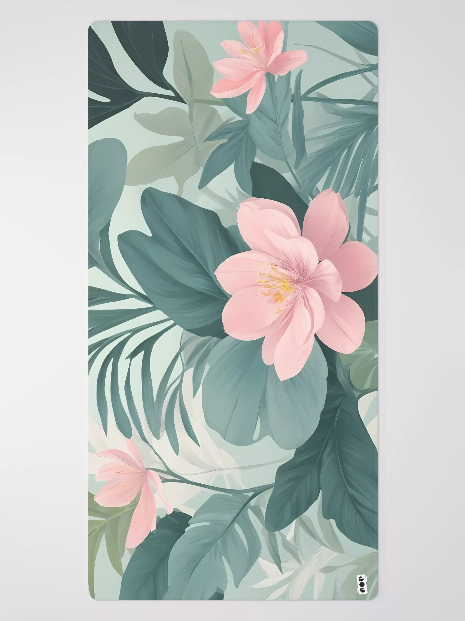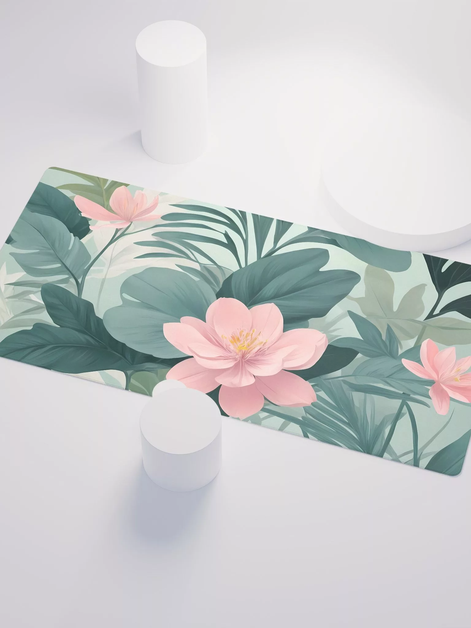 A tranquil blend of painted flowers and plants in soothing pastel hues. This enchanting design features delicate shades of green with soft pink flowers, set against a gentle backdrop. Perfect for those who seek a calming and elegant workspace, the Pastel Serenity 2 Desk Mat transforms your desk into a peaceful garden retreat.